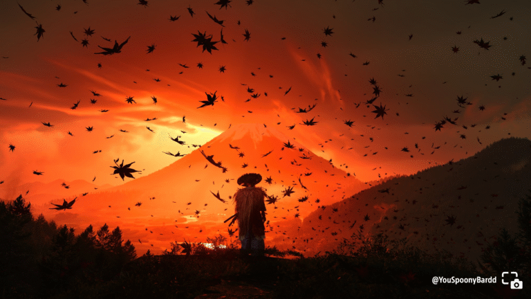 YouSpoonyBardd shares an orange sunset sky facing Mount Yōtei with leaves falling around Atsu.
